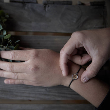 Das Armband kann ganz praktisch dank des Makrameeknotens an dein Handgelenk angepasst werden.