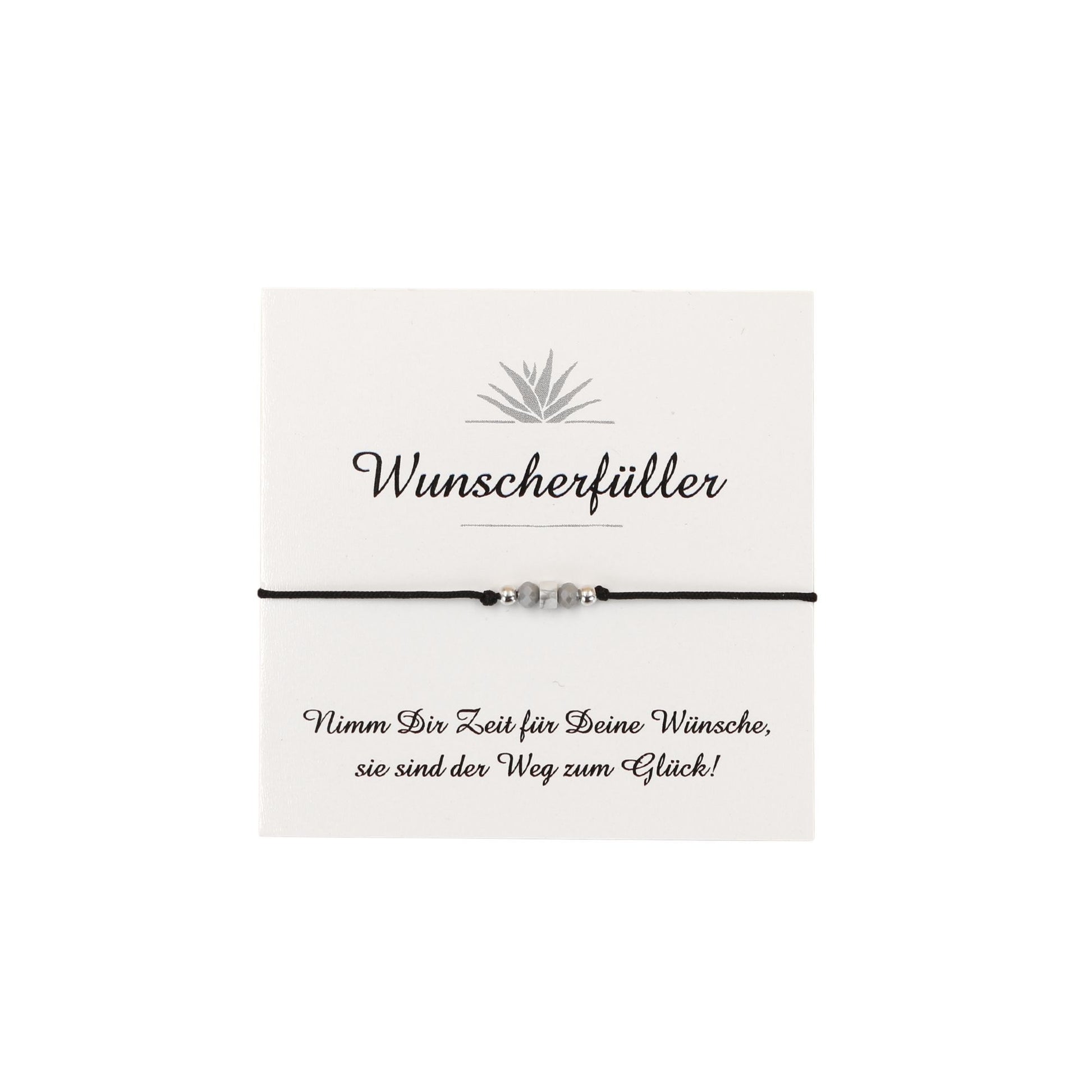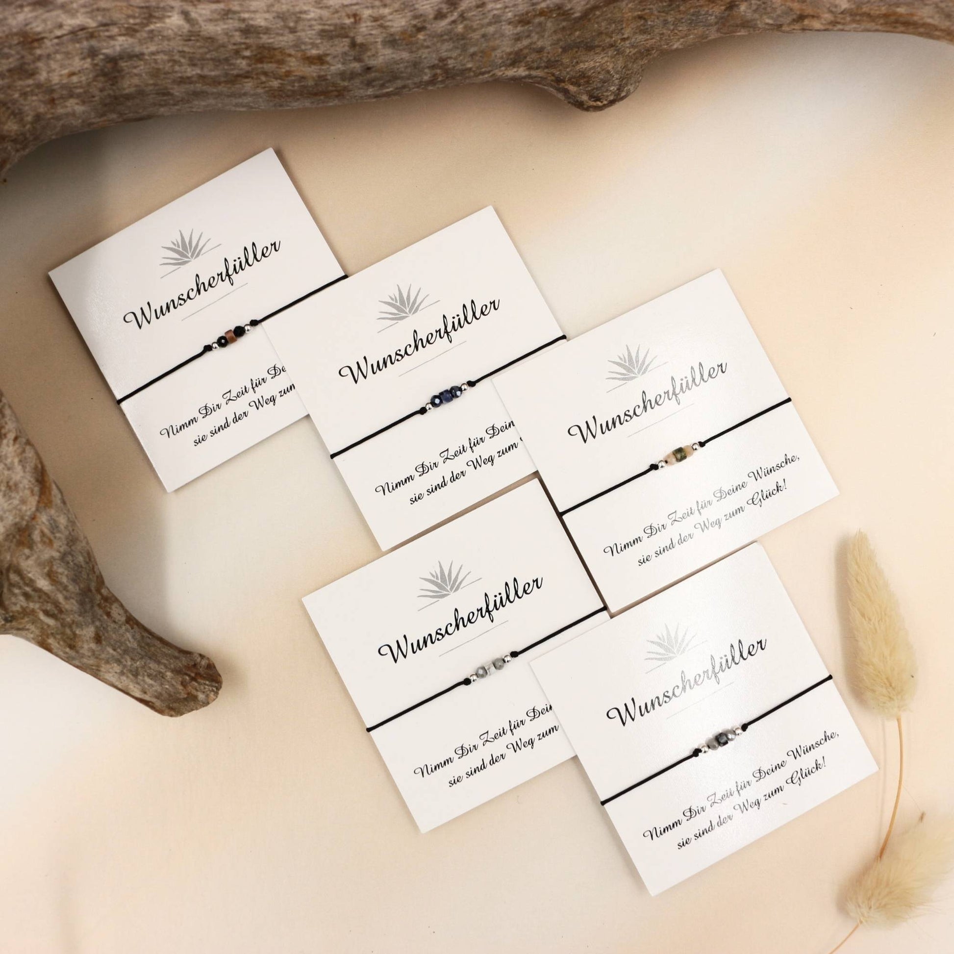 Die Armbänder sind auf einer Geschenkkarte mit dem Spruch: "Nimm Dir Zeit für Deine Wünsche, sie sind der Weg zum Glück!" angebracht.