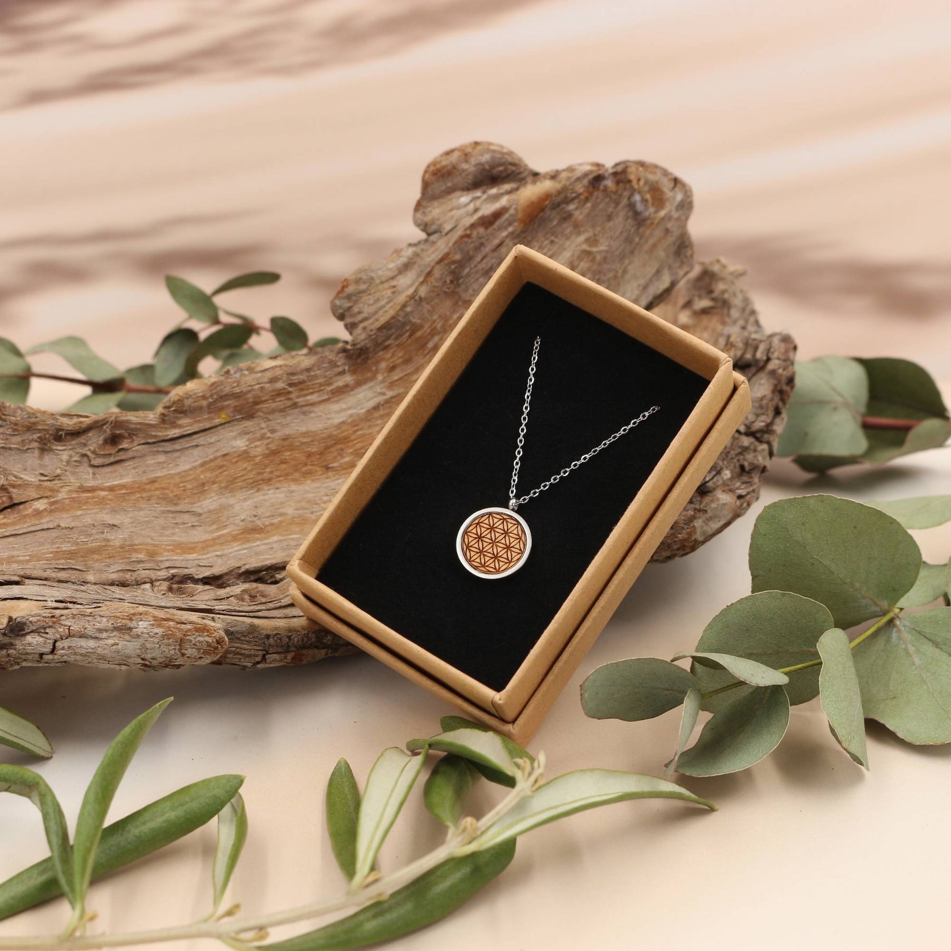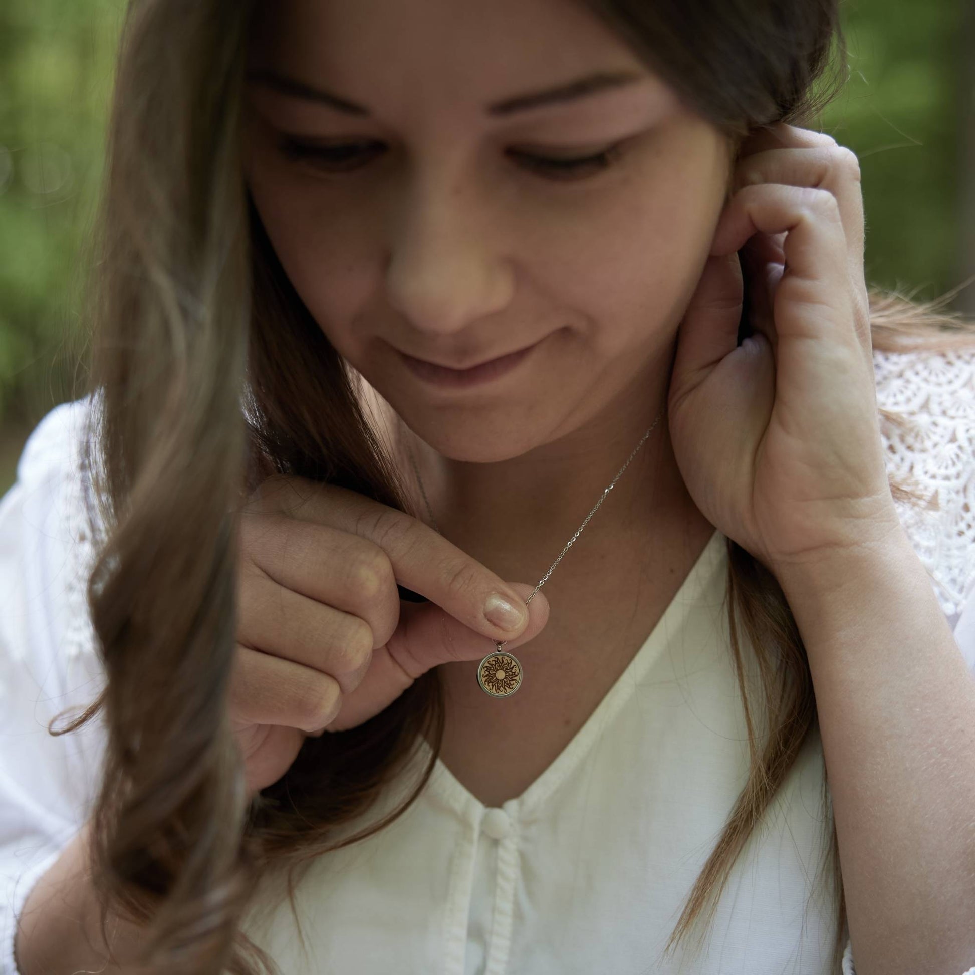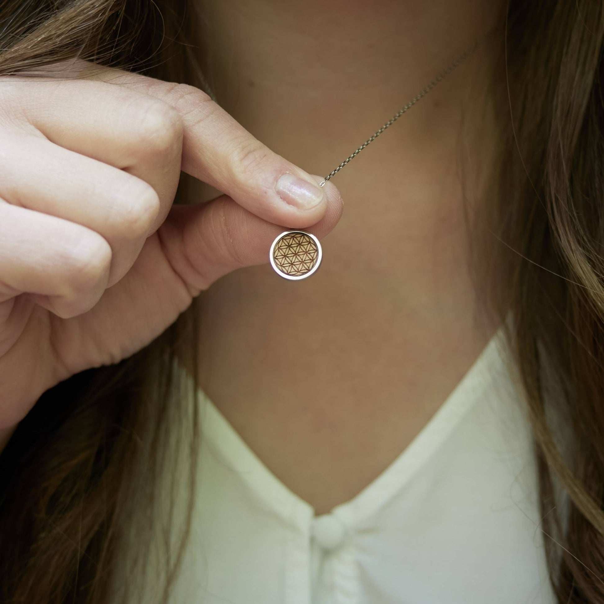 Die Halskette mit Anhänger ist ein besonderer Alltagsbegleiter. Die runde Edelstahlfassung des Anhängers umfasst die gravierte Holzeinlage aus Buchenholz, auf welcher das Symbol sichtbar ist.