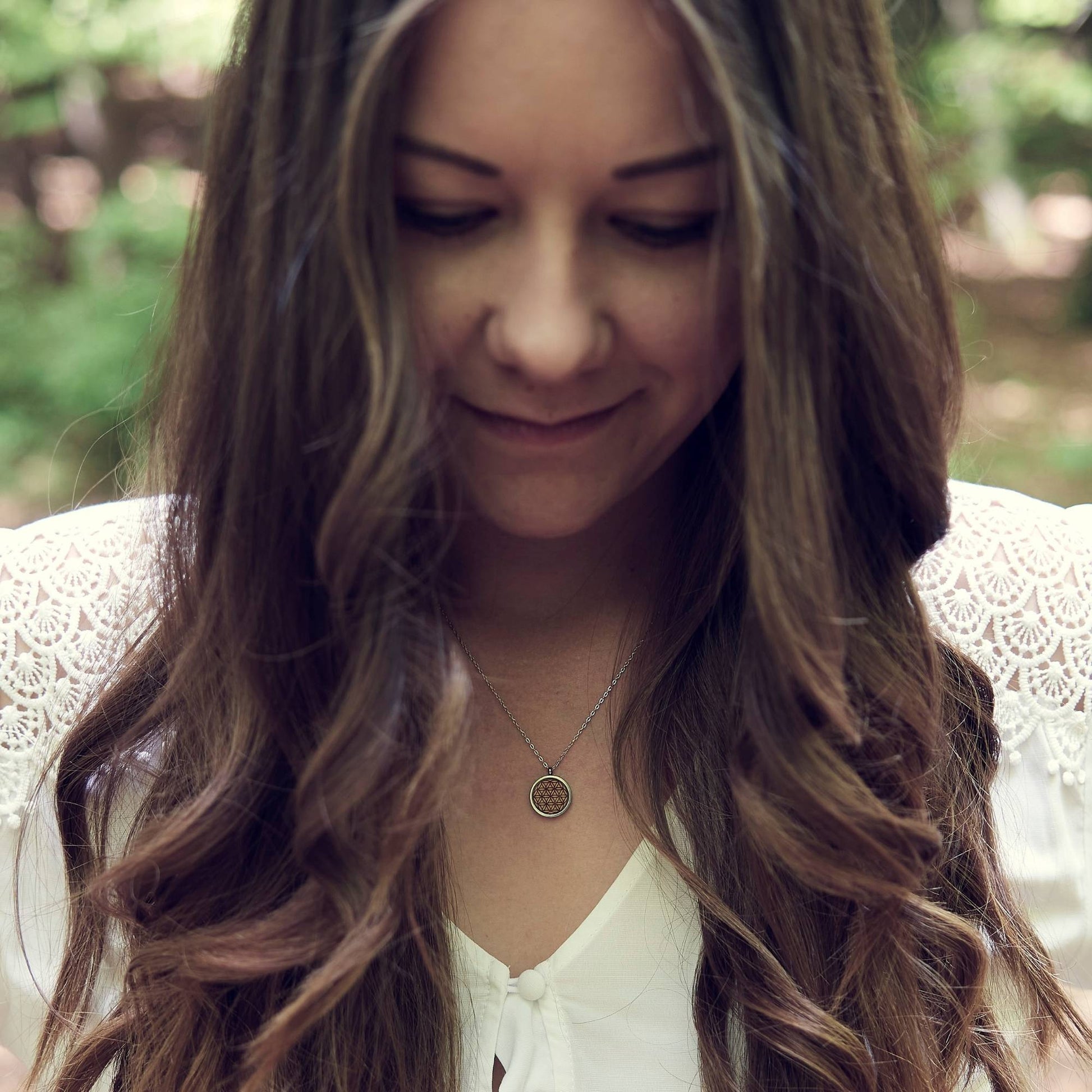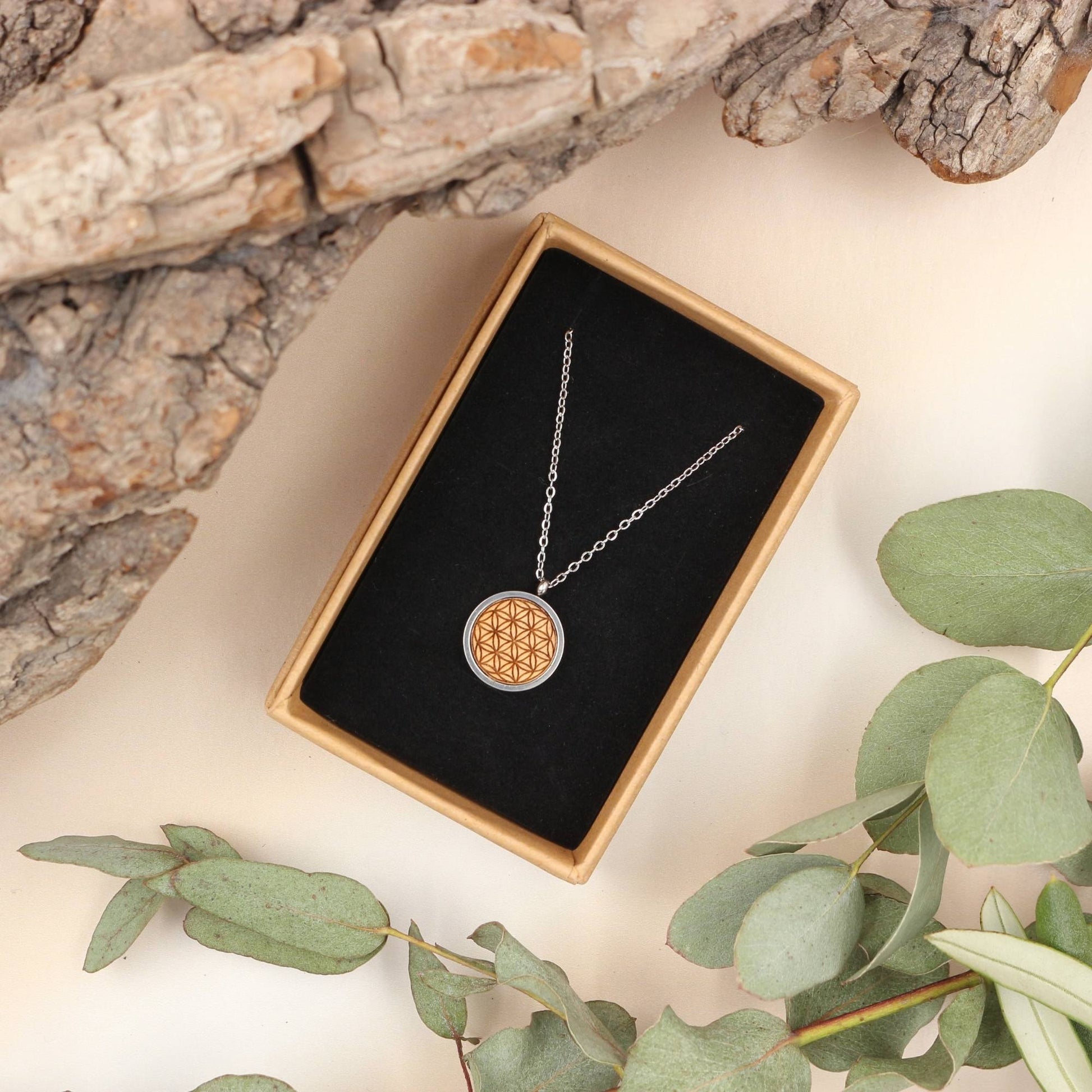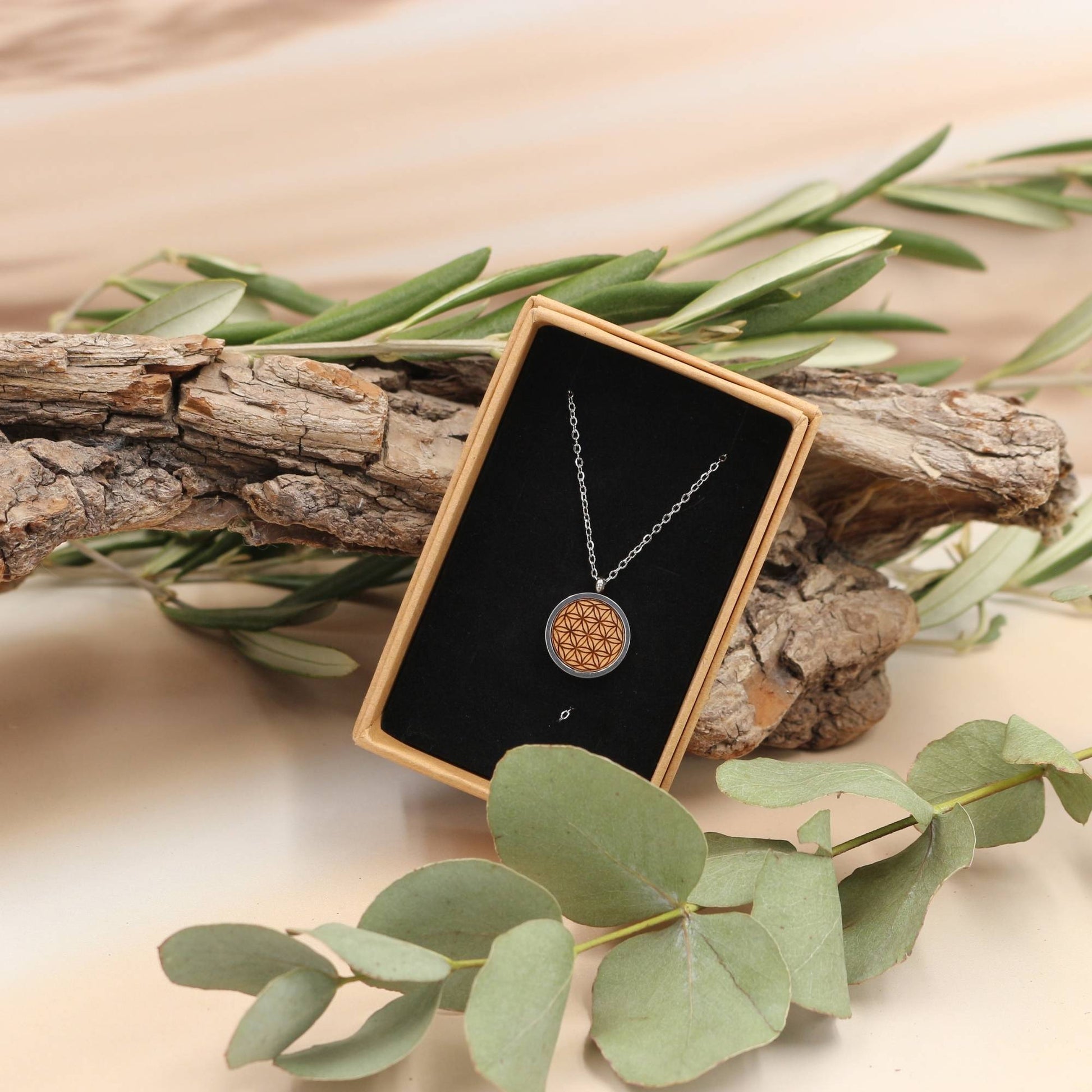 Die Halskette mit Anhänger ist ein besonderer Alltagsbegleiter. Die runde Edelstahlfassung des Anhängers umfasst die gravierte Holzeinlage aus Buchenholz, auf welcher das Symbol sichtbar ist.
