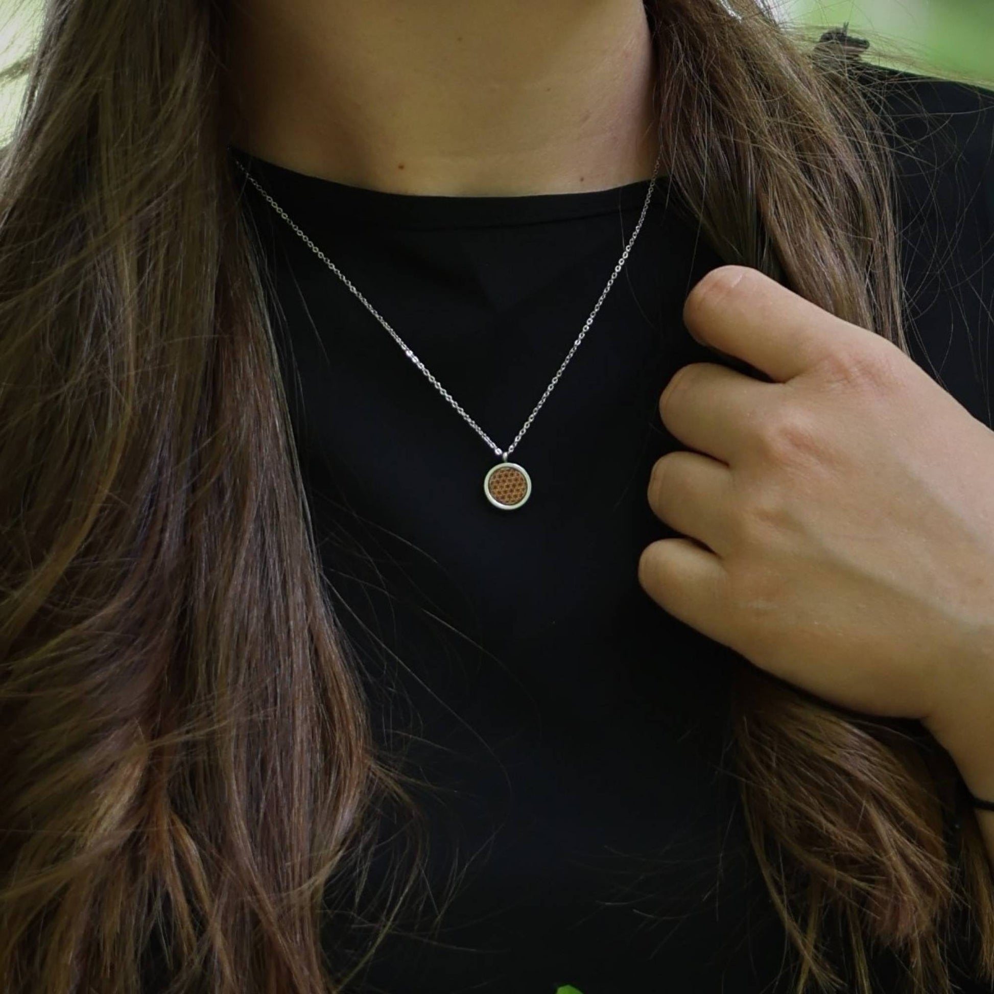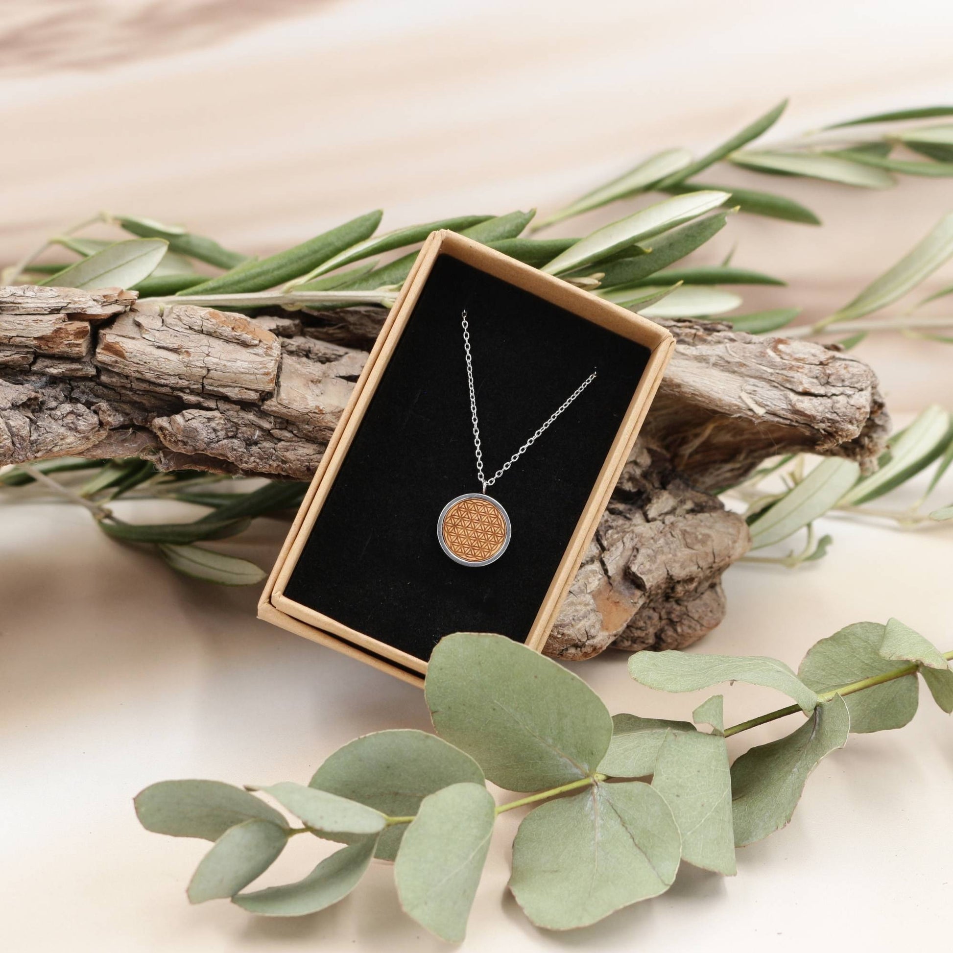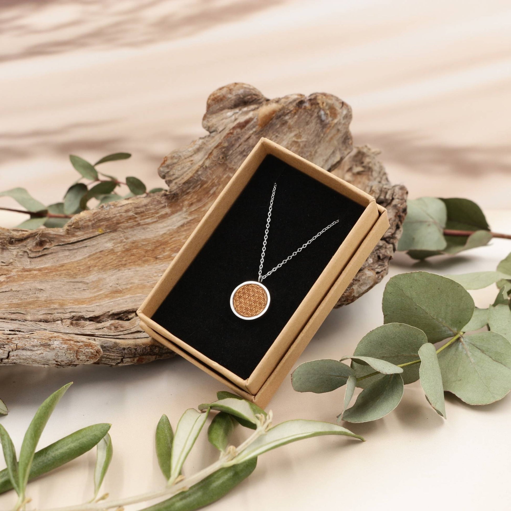 Die Halskette mit Anhänger ist ein besonderer Alltagsbegleiter. Die runde Edelstahlfassung des Anhängers umfasst die gravierte Holzeinlage aus Buchenholz, auf welcher das Symbol sichtbar ist.