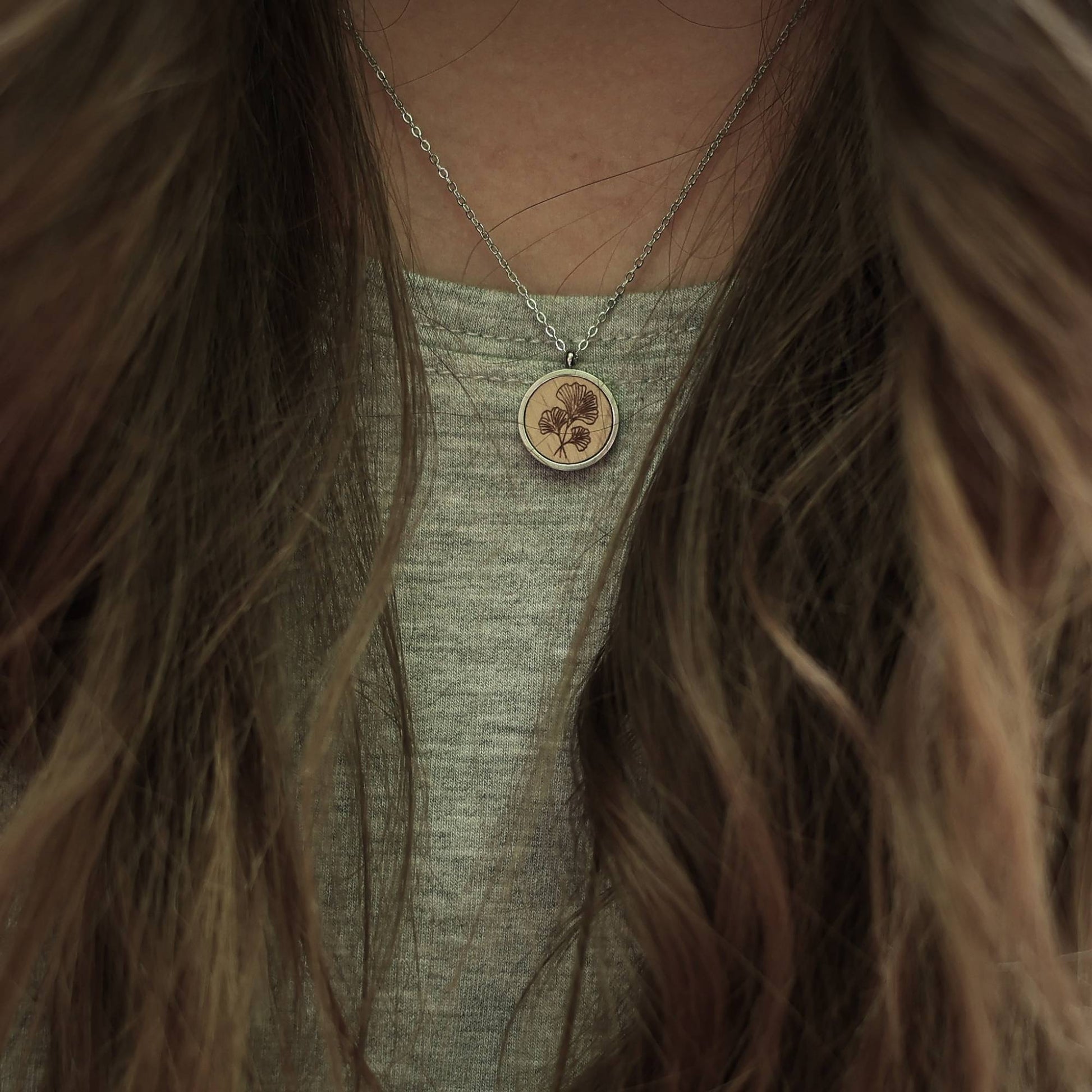 Die Halskette mit Anhänger ist ein besonderer Alltagsbegleiter. Die runde Edelstahlfassung des Anhängers umfasst die gravierte Holzeinlage aus Buchenholz, auf welcher das Symbol sichtbar ist.