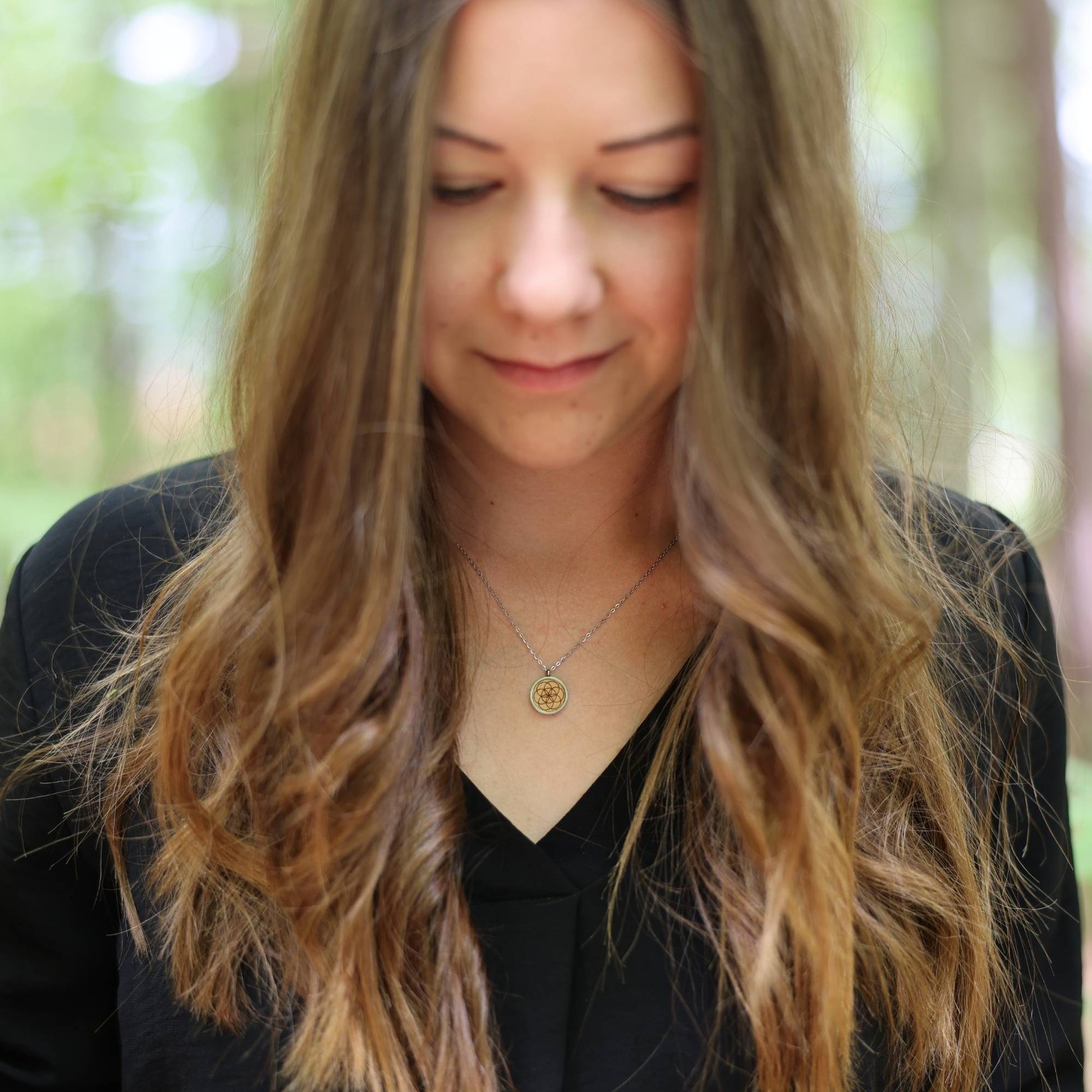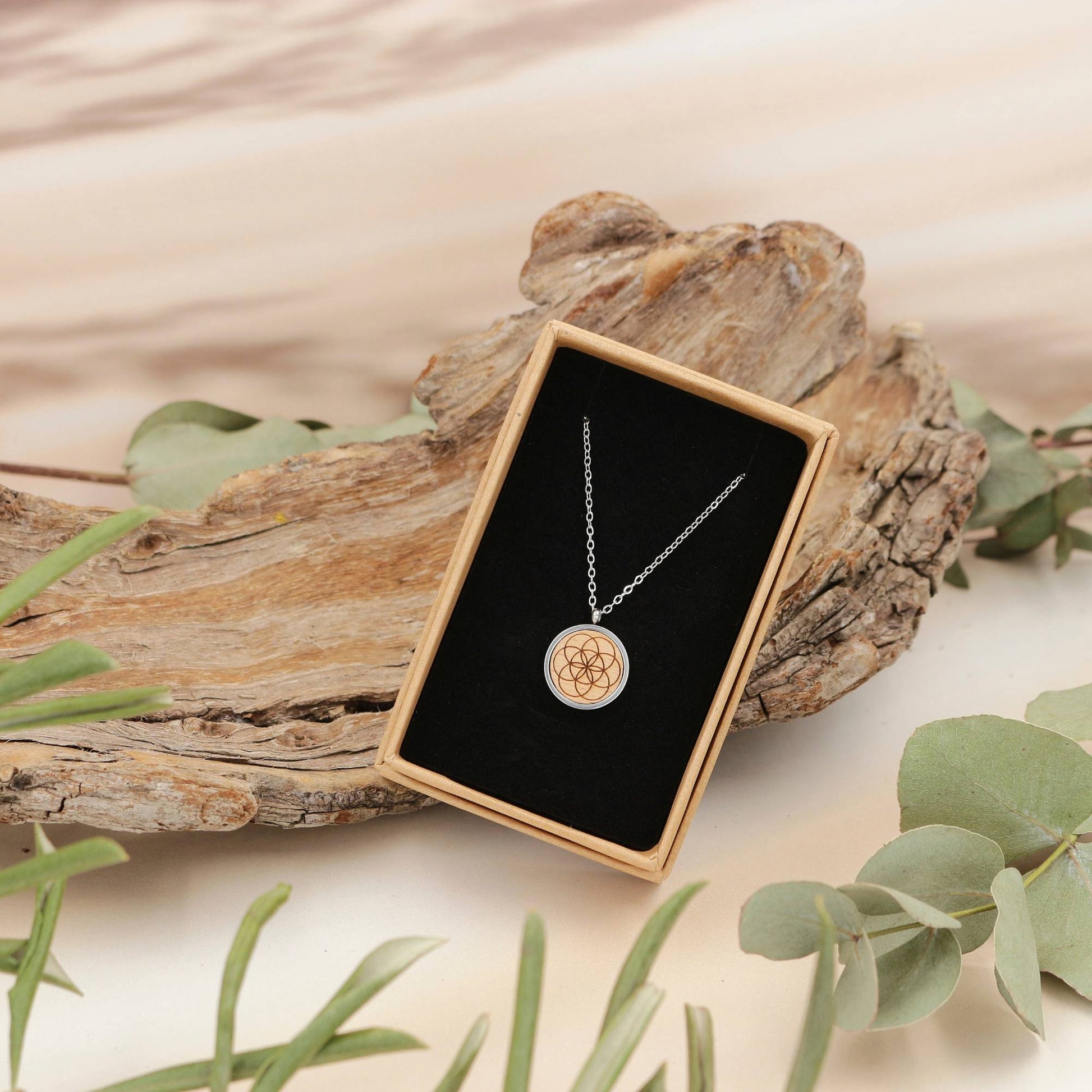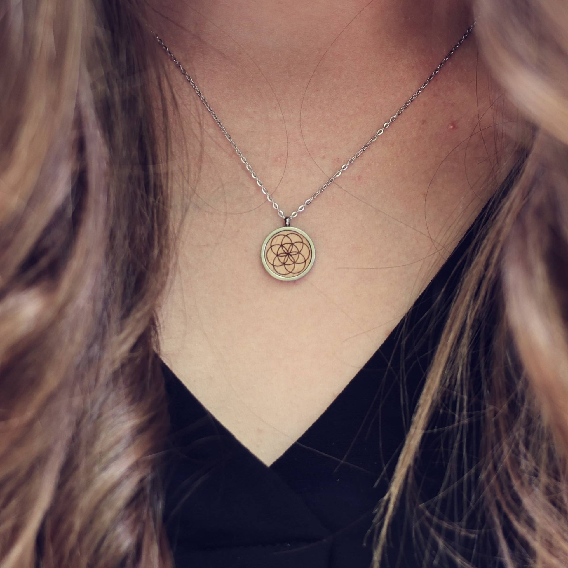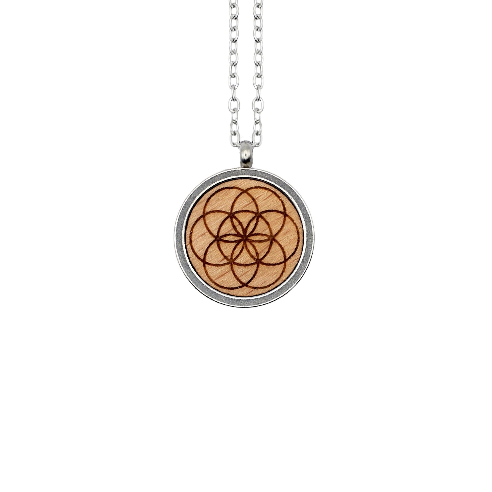 Die Halskette mit Anhänger ist ein besonderer Alltagsbegleiter. Die runde Edelstahlfassung des Anhängers umfasst die gravierte Holzeinlage aus Buchenholz, auf welcher das Symbol sichtbar ist.