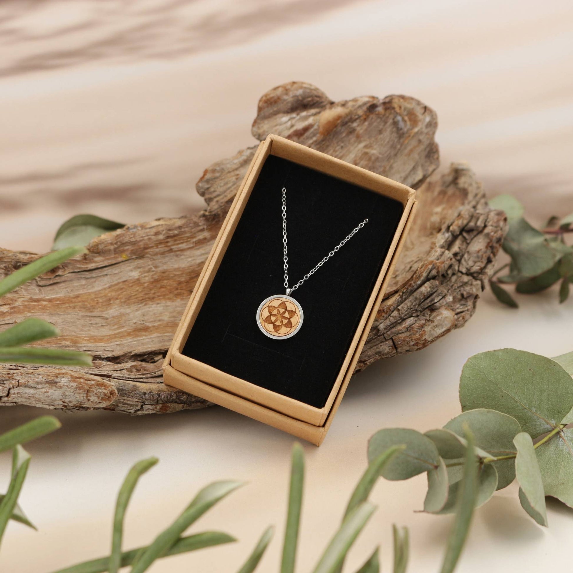 Die Halskette mit Anhänger ist ein besonderer Alltagsbegleiter. Die runde Edelstahlfassung des Anhängers umfasst die gravierte Holzeinlage aus Buchenholz, auf welcher das Symbol sichtbar ist.